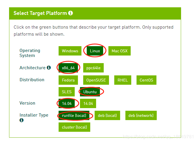 在相應(yīng)提供的下載鏈接的界面,按照如下所標(biāo)注的內(nèi)容進(jìn)行:(我本人的是 Ubuntu服務(wù)器,16.04的,在這里我們選擇runfile的安裝形式)