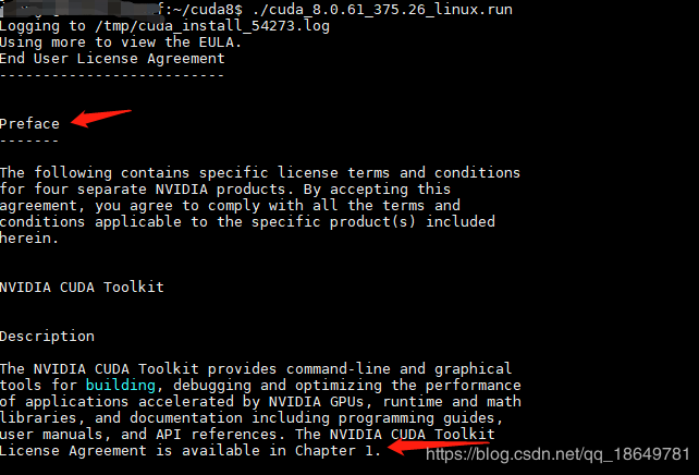 cd CUDA8 # 進(jìn)入包含上述下載文件的文件夾 sudo chmod 777 cuda_8.0.61_375.26_linux.run ##給文件一定的權(quán)限 ./cuda_8.0.61_375.26_linux.run ## 開(kāi)始安裝