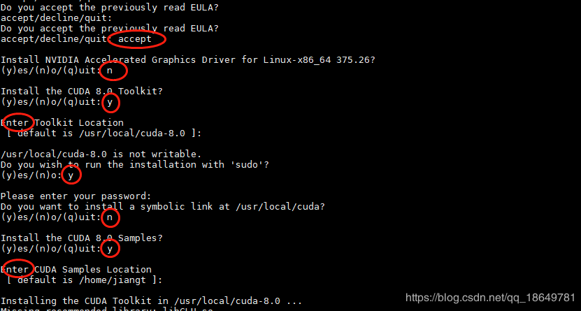 當(dāng)你跳過(guò)了介紹文檔之后,接下來(lái)會(huì)出現(xiàn)一些需要你選擇的選項(xiàng):(每一步對(duì)應(yīng)的輸入都在下圖中用紅色的圓圈標(biāo)注出來(lái)了,在這里解釋一點(diǎn):Driver一定要選擇 n,因?yàn)槟阒坝醒b的支持CUDA9.0的驅(qū)動(dòng),所以就不用在裝新的)
