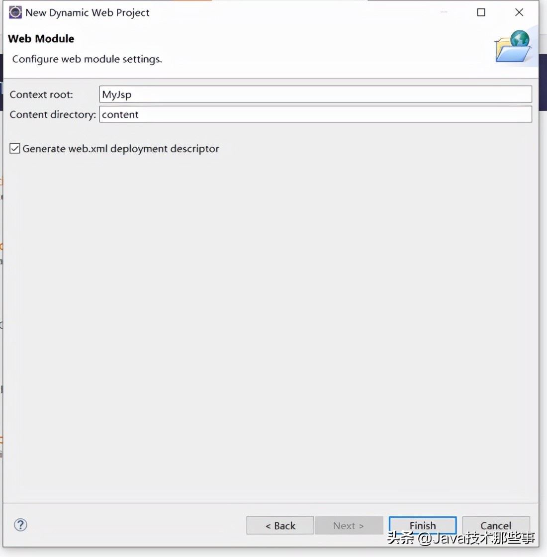 7.之后next,next,然后勾選創(chuàng)建web.xml文件,此處我把content directory改為content,這樣創(chuàng)建的目錄會有所不同,不過對Tomcat配置沒有影響。弄完直接finish即可。