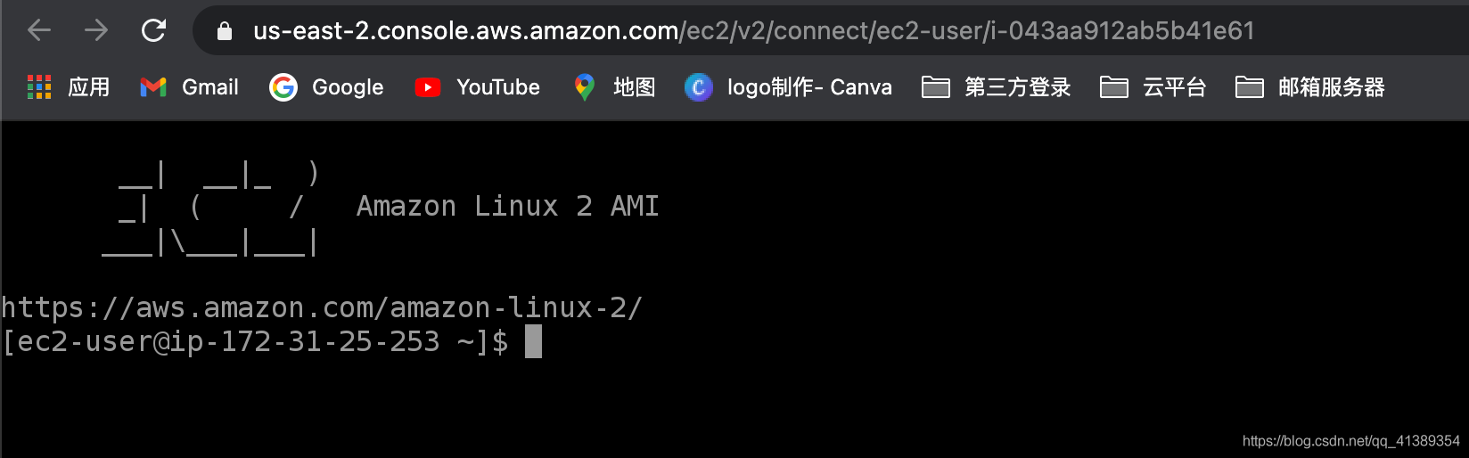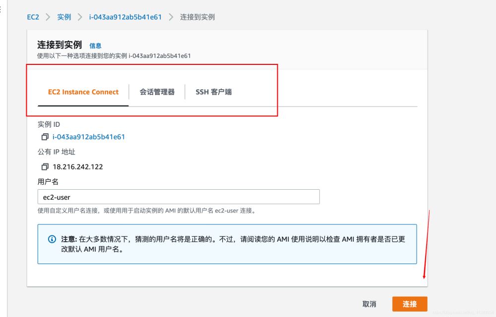 右上角有連接,我們點擊連接。這里我們直接采用瀏覽器進行遠程連接。還記得剛才下載的密鑰嗎,通過ssh工具如xshell工具使用密鑰文件可以直接連接這臺服務器。我們連接的用戶名只能是ec2-user