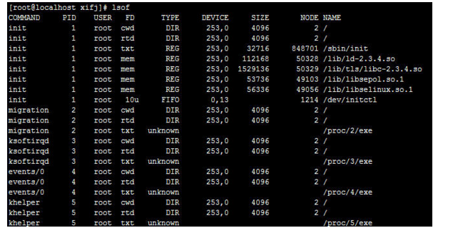 在終端下輸入lsof即可顯示系統(tǒng)打開的文件,因為 lsof 需要訪問核心內(nèi)存和各種文件,所以必須以 root 用戶的身份運行它才能夠充分地發(fā)揮其功能。