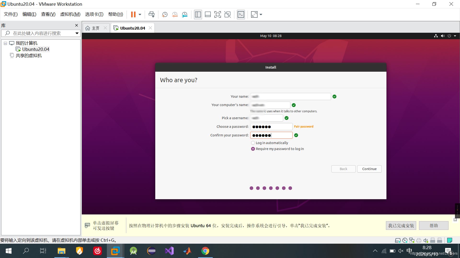 6、輸入用戶名,虛擬機(jī)器的名稱,然后輸入密碼、確認(rèn)密碼。都輸入完了之后,就可以“Continue”