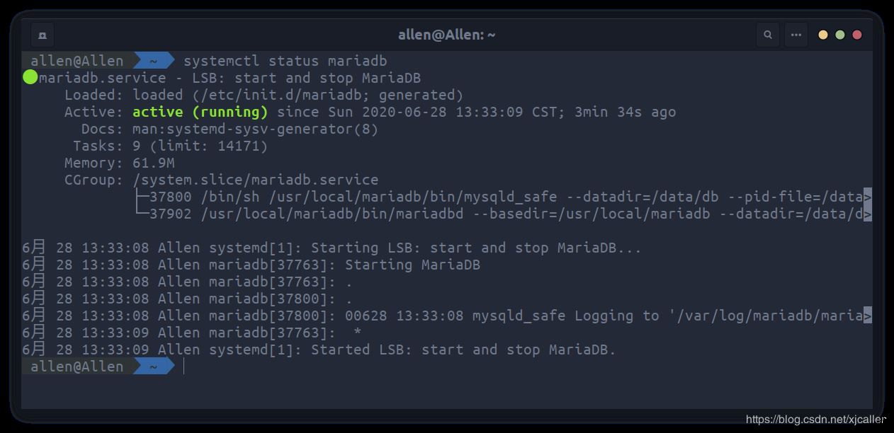 sudo rm -rf /etc/mysql sudo apt remove -y mysql-common sudo apt autoremove -y sudo apt install -y cmake libncurses5-dev libgnutls28-dev sudo groupadd -r mysql && sudo useradd -r -g mysql -s /sbin/nologin -d /usr/local/mariadb mysql sudo mkdir -p /data/db /var/log/mariadb cd /home/allen/下載/mariadb-10.5.4/ cmake . -DCMAKE_INSTALL_PREFIX=/usr/local/mariadb -DMYSQL_DATADIR=/data/db -DSYSCONFDIR=/etc -DWITHOUT_TOKUDB=1 -DMYSQL_UNIX_ADDR=/tmp/mysql.sock -DDEFAULT_CHARSET=utf8mb4 -DDEFAULT_COLLATION=utf8mb4_general_ci make -j 4 && sudo make install sudo /usr/local/mariadb/scripts/mysql_install_db --user=mysql --datadir=/data/db sudo vim /etc/my.cnf [mysqld] datadir = /data/db socket = /tmp/mysql.sock # 建議禁用符號(hào)鏈接,防止各類安全風(fēng)險(xiǎn) symbolic-links = 0 collation-server = utf8mb4_general_ci init-connect = 'SET NAMES utf8mb4' character-set-server = utf8mb4 [mysql] default-character-set = utf8mb4 [client] port = 3306 socket = /tmp/mysql.sock default-character-set = utf8mb4 [mysqld_safe] log-error = /var/log/mariadb/mariadb.log pid-file = /var/run/mariadb/mariadb.pid sudo cp /usr/local/mariadb/support-files/mysql.server /etc/init.d/mariadb sudo vim /etc/profile.d/mariadb.sh export PATH=$PATH:/usr/local/mariadb/bin/ sudo chmod 0777 /etc/profile.d/mariadb.sh source /etc/profile.d/mariadb.sh sudo /etc/init.d/mariadb start #Starting mariadb (via systemctl): mariadb.service. sudo /usr/local/mariadb/bin/mysql_secure_installation #NOTE: RUNNING ALL PARTS OF THIS SCRIPT IS RECOMMENDED FOR ALL MariaDB # SERVERS IN PRODUCTION USE! PLEASE READ EACH STEP CAREFULLY! #In order to log into MariaDB to secure it, we'll need the current #password for the root user. If you've just installed MariaDB, and #haven't set the root password yet, you should just press enter here. #Enter current password for root (enter for none): #OK, successfully used password, moving on... #Setting the root password or using the unix_socket ensures that nobody #can log into the MariaDB root user without the proper authorisation. #You already have your root account protected, so you can safely answer 'n'. #Switch to unix_socket authentication [Y/n] y #Enabled successfully! #Reloading privilege tables.. # ... Success! #You already have your root account protected, so you can safely answer 'n'. #Change the root password? [Y/n] y #New password: #Re-enter new password: #Password updated successfully! #Reloading privilege tables.. # ... Success! #By default, a MariaDB installation has an anonymous user, allowing anyone #to log into MariaDB without having to have a user account created for #them. This is intended only for testing, and to make the installation #go a bit smoother. You should remove them before moving into a #production environment. #Remove anonymous users? [Y/n] y # ... Success! #Normally, root should only be allowed to connect from 'localhost'. This #ensures that someone cannot guess at the root password from the network. #Disallow root login remotely? [Y/n] n # ... skipping. #By default, MariaDB comes with a database named 'test' that anyone can #access. This is also intended only for testing, and should be removed #before moving into a production environment. #Remove test database and access to it? [Y/n] y # - Dropping test database... # ... Success! # - Removing privileges on test database... # ... Success! #Reloading the privilege tables will ensure that all changes made so far #will take effect immediately. #Reload privilege tables now? [Y/n] y # ... Success! #Cleaning up... #All done! If you've completed all of the above steps, your MariaDB #installation should now be secure. #Thanks for using MariaDB! sudo systemctl enable mariadb sudo chown mysql:mysql -R /usr/local/mariadb /data/db /var/log/mariadb reboot