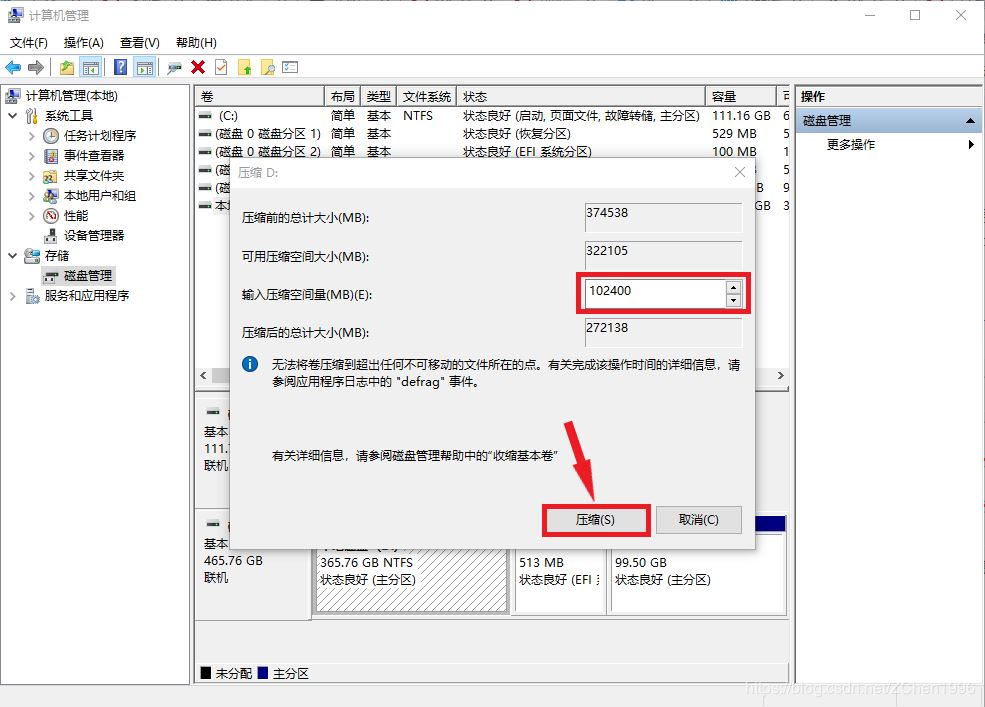右鍵選擇壓縮卷,壓縮出50G以上的空白分區(qū)(我分了100G)