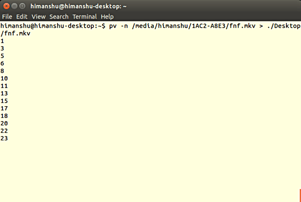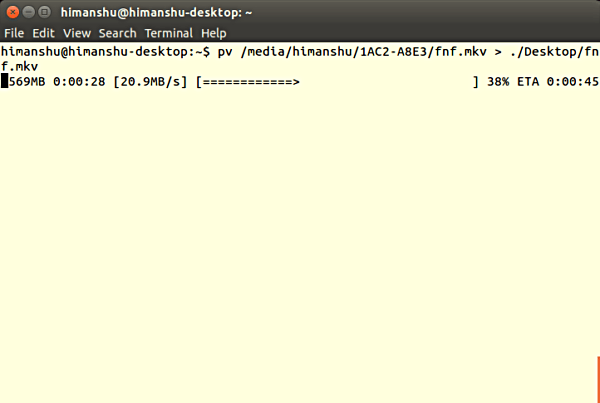 pv /media/himanshu/1AC2-A8E3/fNf.mkv > ./Desktop/fnf.mkv
