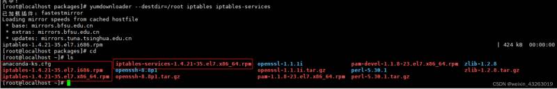 # 安裝yum-utils軟件,--destdir指定目錄, 最后面指定需要安裝的包名 yumdownloader --destdir=/root iptables iptables-services cd /root ls