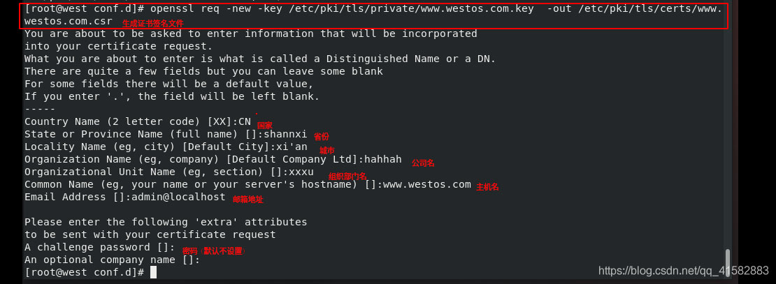 (3)生成證書簽名文件:openssl req -new -key /etc/pki/tls/private/www.westos.com.key -out /etc/pki/tls/cert/www.westos.com.csr