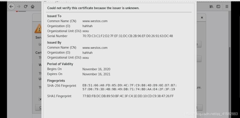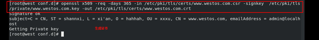openssl x509 -req -days 365 -in /etc/pki/tls/certs/www.westos.com.csr -signkey /etc/pki/tls/private/www.westos.com.key -out /etc/pki/tls/certs/www.westos.com.crt ## x509:證書格式 ## -req請求 ## -in加載簽證名稱 ## -signkey
