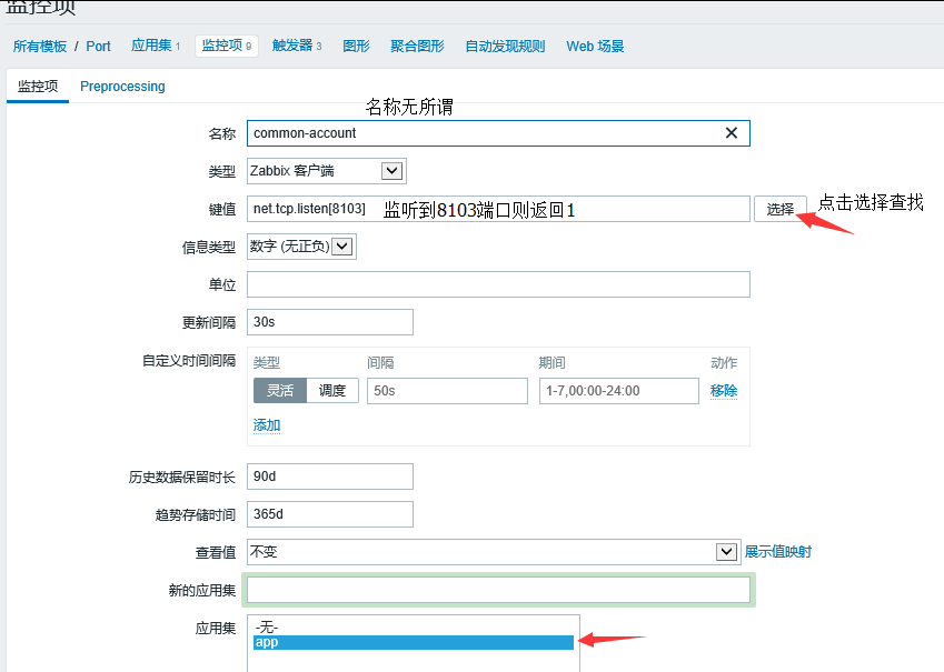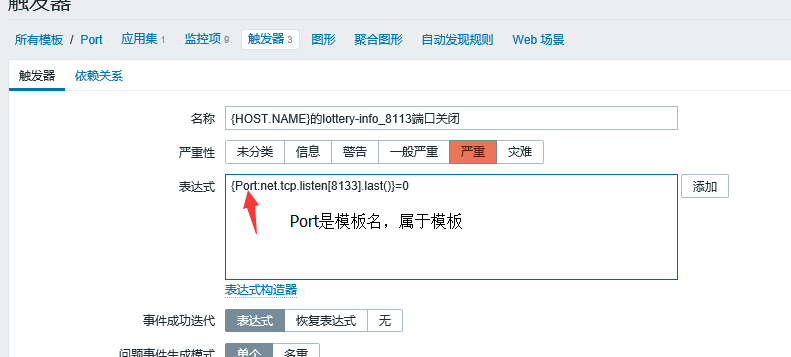 6.Port是模板名,如果這里選擇寫主機名或主機ip,則會變成單個主機的監(jiān)控項,而不是模板的。