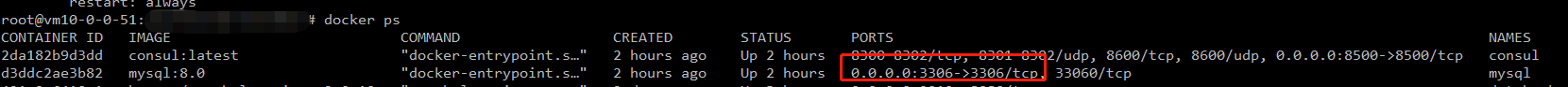 啟動(dòng)成功之后,可以看到 3306 端口也映射出來(lái)了。