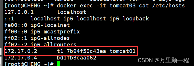 在tomcat03的hosts配置文件中,可以看到映射了tomcat01的IP、容器名、別名和容器id,所有tomcat03可以通過(guò)指定的容器名和tomcat01進(jìn)行通信。