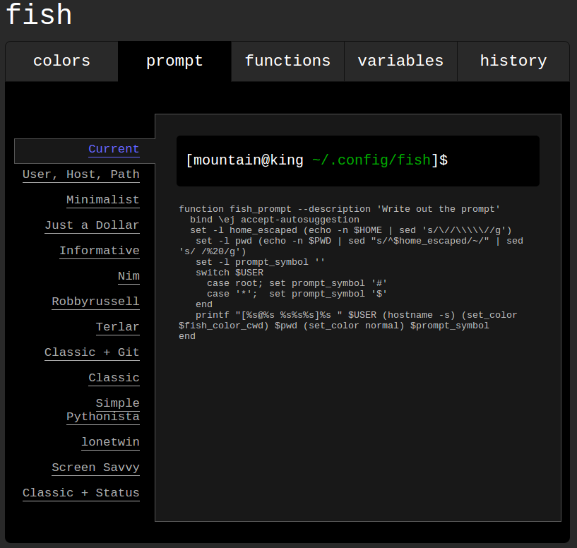 2.命令行提示(在web界面配置,完成后會(huì)生成~/.config/fish/functions/fish_prompt.fish):