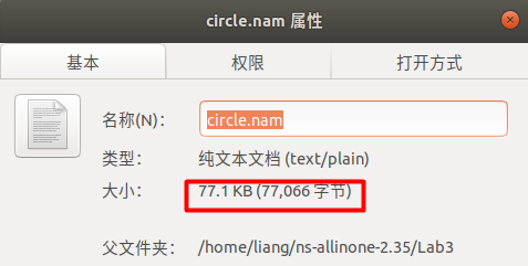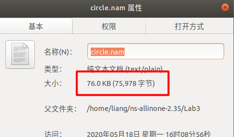 此時的trace文件大小為91.8kb,nam文件大小為76.0kb。