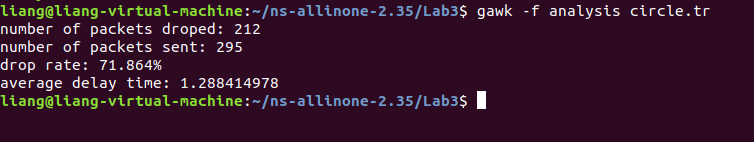 結(jié)果得到網(wǎng)絡(luò)模擬過程的丟包數(shù)、發(fā)包數(shù)、丟包率和平均延時。