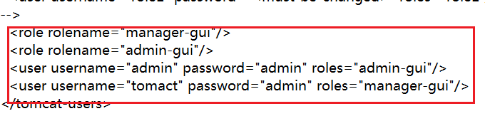 <role rolename="manager-gui"/> <role rolename="admin-gui"/> <user username="admin" password="admin" roles="admin-gui"/> <user username="tomcat" password="admin" roles="manager-gui"/>