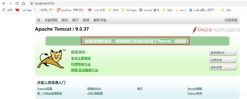 打開瀏覽器,輸入http://localhost:8080或http://127.0.0.1:8080,進入tomcat歡迎頁面,