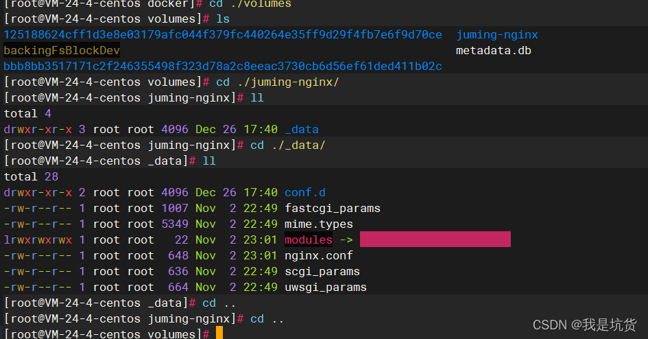 我們可以cd到這個路徑下面看一下數(shù)據(jù)卷,像我就cd到第二個具名掛載nginx的數(shù)據(jù)卷目錄下面看一下具體結(jié)構(gòu)