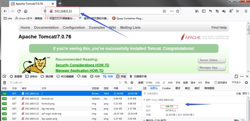 提示:可以看到我們訪問192.168.0.22時,瀏覽器返回了tomcat中l(wèi)ocalhost提供的主頁;