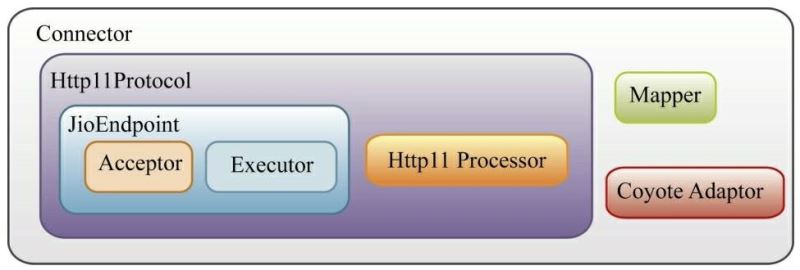 Http11Protocol表示阻塞式的HTTP協(xié)議的通信,它包含從套接字連接接收、處理、響應(yīng)客戶端的整個過程。它主要包含JIoEndpoint組件和Http11Processor組件。啟動時,JIoEndpoint組件將啟動某個端口的監(jiān)聽,一個請求到來后將被扔進(jìn)線程池,線程池進(jìn)行任務(wù)處理,處理過程中將通過協(xié)議解析器Http11Processor組件對HTTP協(xié)議解析,并且通過適配器Adapter匹配到指定的容器進(jìn)行處理以及響應(yīng)客戶端。