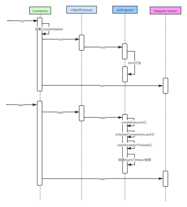 上面的時序圖給我們分析Connector組件的源代碼提供了思路:從連接器組件的init方法和start方法開始分析。