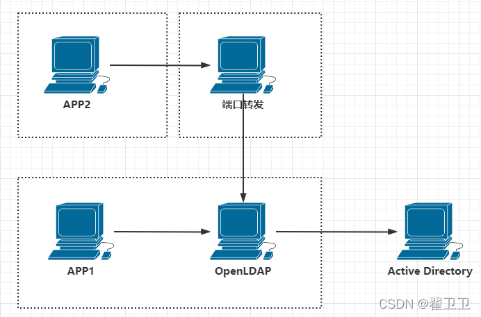 最近同事在測(cè)試和生產(chǎn)環(huán)境中分別部署了一套應(yīng)用,由于應(yīng)用只能集成LDAP,而我們公司使用的是AD,于是我搭建了一個(gè)OpenLDAP服務(wù),賬號(hào)先通過(guò)lsc從AD同步到OpenLDAP,然后使用saslauthd傳遞身份驗(yàn)證到AD。在測(cè)試環(huán)境中我們的應(yīng)用能夠連接LDAP登錄,但是在生產(chǎn)環(huán)境中卻無(wú)法訪(fǎng)問(wèn)到OpenLDAP服務(wù)器,我不想重復(fù)的在生產(chǎn)環(huán)境重新安裝維護(hù)一套OpenLDAP服務(wù),這個(gè)過(guò)程比較繁瑣,還需通過(guò)定時(shí)任務(wù)每天讓AD的賬號(hào)與OpenLDAP同步,于是我想這可以通過(guò)端口轉(zhuǎn)發(fā)實(shí)現(xiàn),節(jié)點(diǎn)之間的拓?fù)浯蟾畔裣旅孢@樣。