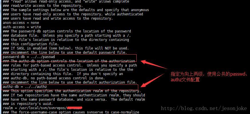 4、修改warehouse1/conf下的svnserve.conf文件,將其中的passwd文件制定與authz文件制定進(jìn)行修改,其他配置按正常單svn配置。(warehouse2同樣設(shè)置一遍)