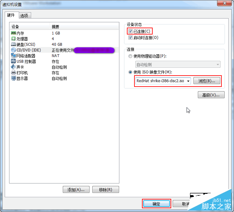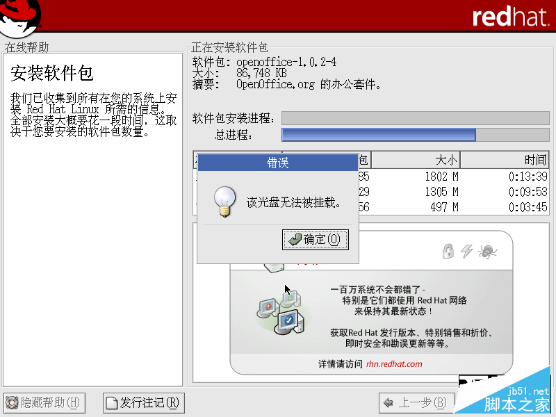 不過,大多數(shù)人都沒有勾選上圖【設備狀態(tài)】面板中的【已連接】,從而導致更換后的ISO鏡像文件并沒有生效,因此RedHat Linux安裝程序也檢測不到更換后的光盤,從而提示錯誤信息:該光盤無法被掛載。