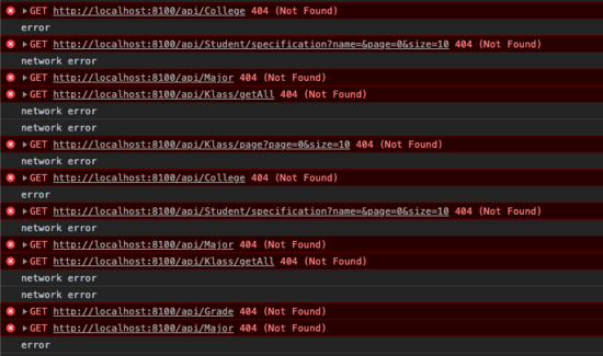 接下來(lái)出現(xiàn)了問(wèn)題:前臺(tái)發(fā)起的請(qǐng)求,只有極少數(shù)能被后臺(tái)接收到,大部分都是404,隨著在瀏覽器中的點(diǎn)擊,控制臺(tái)不斷的出現(xiàn)404。