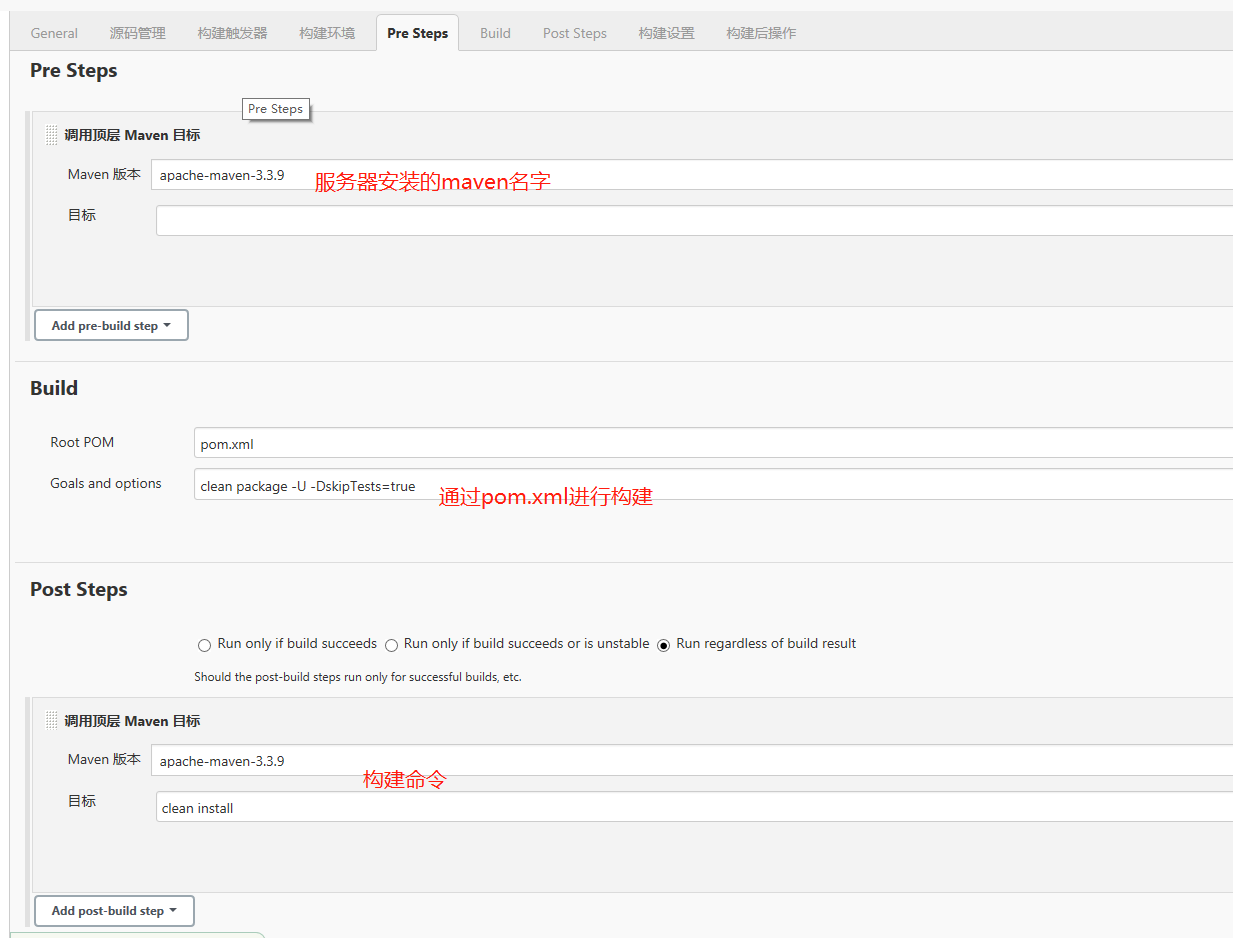 構(gòu)建:Post Steps選擇Send files or execute commands over SSH,下面的構(gòu)建后操作 -> Deploy war/ear to a container 就不需要了: