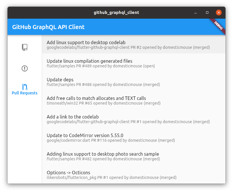 對于帶有分步說明的示例Linux桌面應(yīng)用程序,我建議編寫Write Flutter桌面應(yīng)用程序代碼實驗室,該教程將指導(dǎo)您使用OAuth和GraphQL在Flutter中構(gòu)建GitHub客戶端。