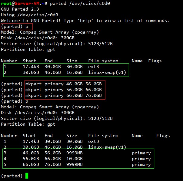 2 連續(xù)劃分三個(gè)大小為10G的主分區(qū),不指定分區(qū)的文件系統(tǒng)類型,parted是劃分后直接生效,沒(méi)有fdisk中類似的w命令。