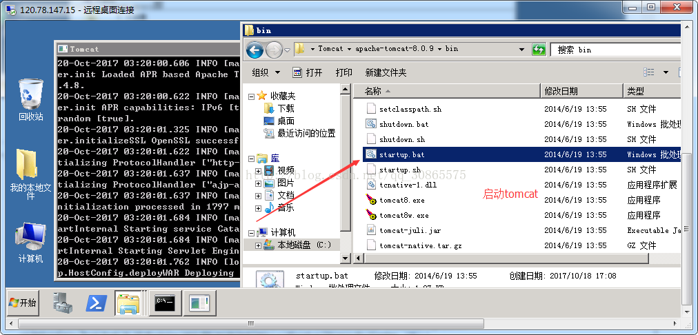 5. 配置好之后。把本地的項(xiàng)目的war包復(fù)制到 服務(wù)器下的Tomcat 目錄的webapps上。 之后啟動(dòng)Tomcat。如圖所示。