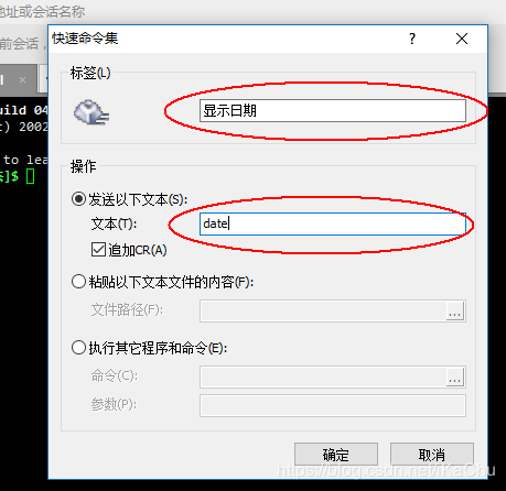 第三步:在彈出的快速命令集對話框中,為你的快捷鍵取一個(gè)名字,并設(shè)置對應(yīng)要執(zhí)行的命令,例如“顯示日期”,對應(yīng)要執(zhí)行的命令是date。