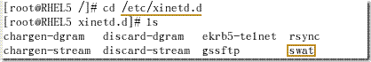 因為swat是xinetd超級守護進程的一個子進程,所以swat工具配置文件在xinetd目錄中。我們要設置swat配置文件,開啟此子進程,以便在啟用xinetd進程是來啟用swat。swat配置文件在/etc/xinetd.d目錄中。