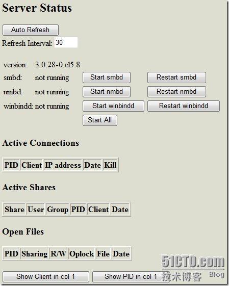 在這個選項中可以啟動和停止samba服務,可以查看活動的連接、共享,打開的文件等。