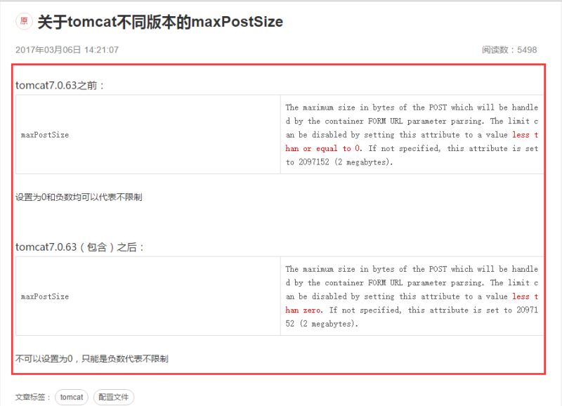 百度了下Tomcat maxPostSize這兩個關鍵詞,很幸運的是第一條就是關于Tomcat不同版本的maxPostSize的設置,