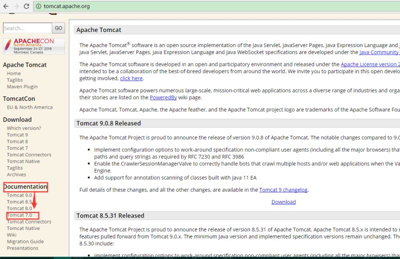 總結:想著昨天出現(xiàn)的這個問題,今天休息正好可以總結一下,接著去看Tomcat官網(wǎng)上的相關文檔,去看下這個問題。如今Tomcat版本更新很快,很多Tomcat7的版本不再好找,我們可以查看最新的Tomcat7版本信息,打開Tomcat官網(wǎng)后,查看