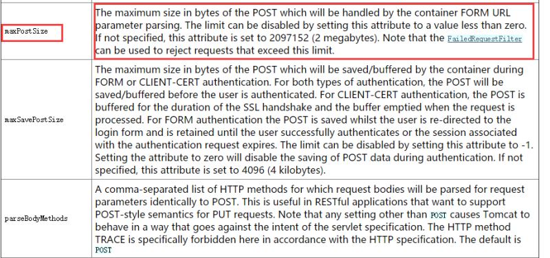 查看相關屬性,我們就會看到maxPostSize的詳細介紹,這個限制必須設置為小于0的負數(shù)才能不限制,缺省下是2097152,也就是2M的大小,單位是Byte。
