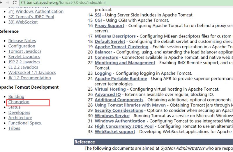 那么我們怎么看Tomcat歷史版本的變化呢,回到剛開始進來的文檔首頁,點擊最下方的Changelog部分,