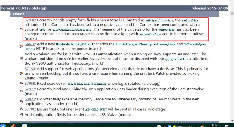 這里面是Tomcat7所有的歷史版本的變化,我們找到Tomcat 7.0.63版本,可以看到變化的第一項就是關于maxPost屬性的內容,上面的博客的哥們果然是滿滿的干貨,雖然內容少,但是一擊必中啊。