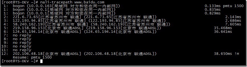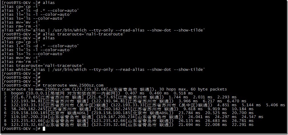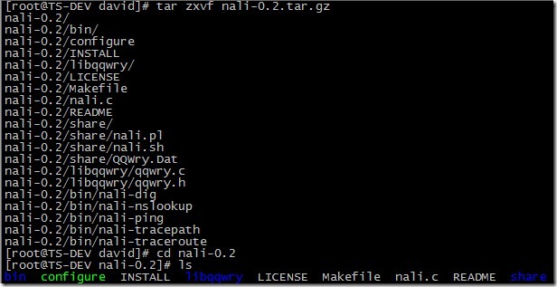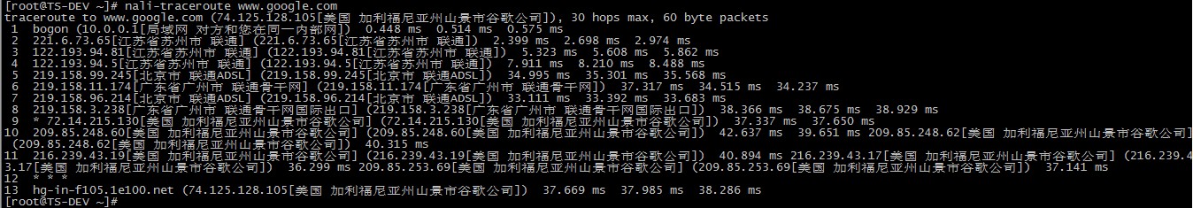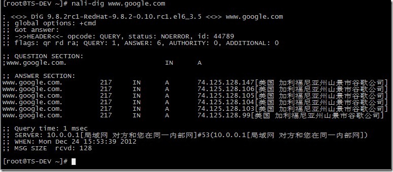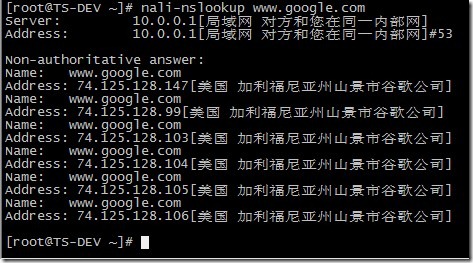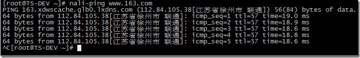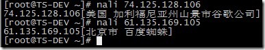 nalinali-dignali-nslookupnali-traceroutenali-tracepathnali-ping使用這些命令的前提是,他們對(duì)應(yīng)的命令必須存在。例如你要用nali-dig,必須保證dig是存在的。他們的用法和原始命令是一樣的。例如nali-dig,用法就和dig一樣。(nali-dig等同于dig |nali)
