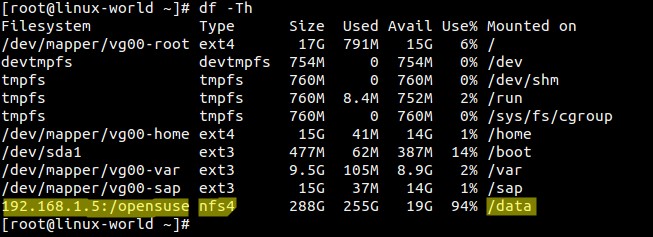 192.168.1.5:/opensuse 301545472 266833920 19371008 94% /data