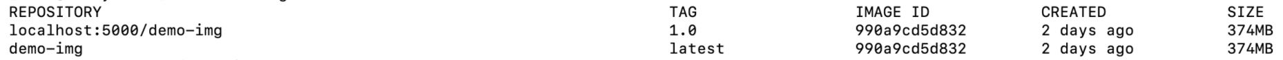 docker tag demo-img:latest localhost:5000/demo-img:1.0 docker push localhost:5000/demo-img:1.0