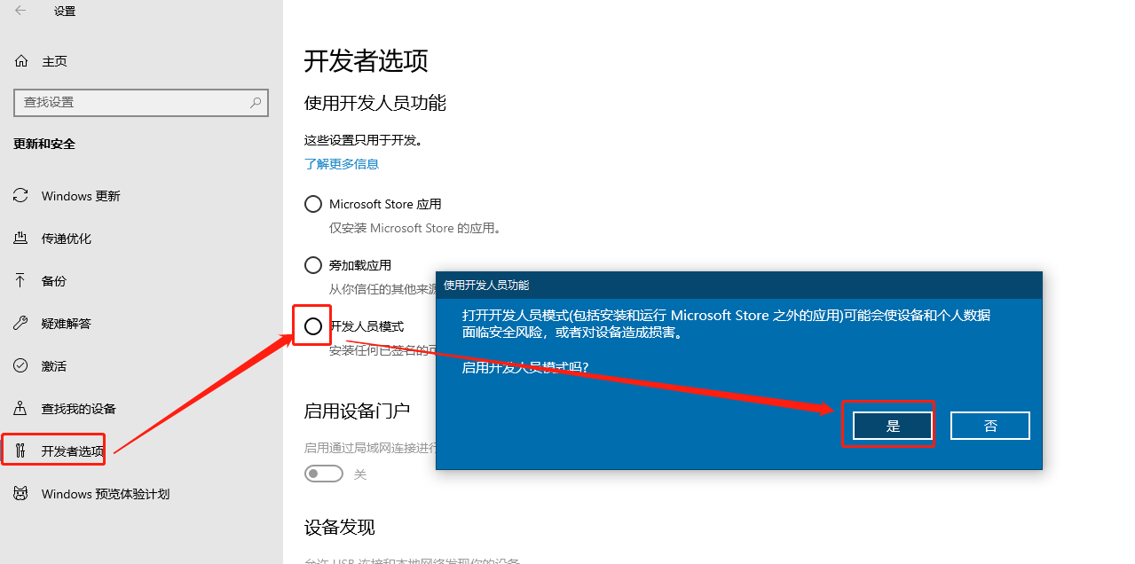 設(shè)置-->更新和安全-->開發(fā)者選項(xiàng)-->開發(fā)人員模式