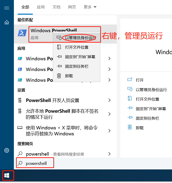 按下 Windows 鍵,搜索 PowerShell 右鍵,以管理員身份運(yùn)行