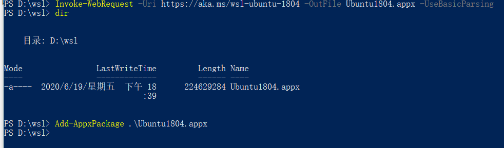 cd D:\wsl\ // 選一個(gè)自己喜歡的目錄,沒有的話自行創(chuàng)建 Invoke-WebRequest -Uri https://aka.ms/wsl-ubuntu-1804 -OutFile Ubuntu1804.appx -UseBasicParsing