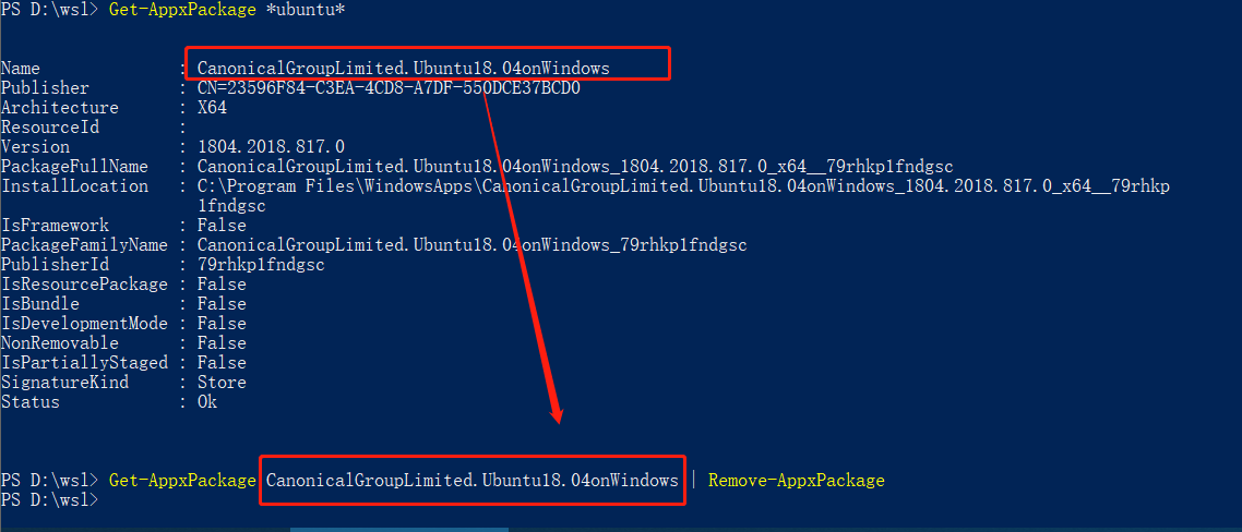 Get-AppxPackage *ubuntu* Get-AppxPackage CanonicalGroupLimited.Ubuntu18.04onWindows | Remove-AppxPackage