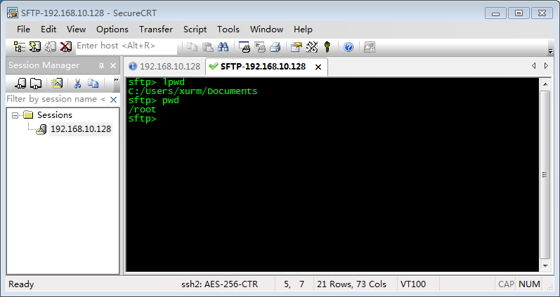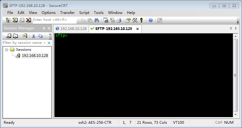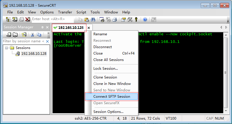 先使用SecureCRT通過(guò)SSH2協(xié)議連接上遠(yuǎn)程主機(jī),在打開的遠(yuǎn)程終端(Terminal)窗口Tab標(biāo)題頁(yè)簽上右鍵->【Connect SFTP Session】,便可打開SFTP會(huì)話窗口(SFTP即Secure File Transfer Protocol):