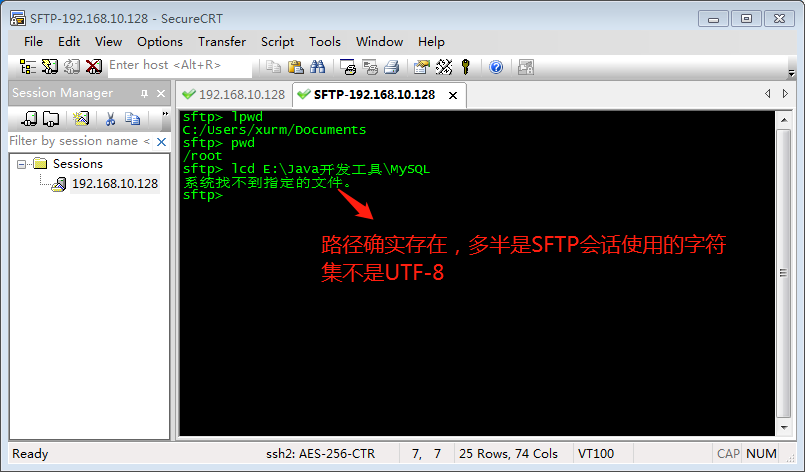 如果 lcd或cd 后面跟的目錄明明存在,卻報(bào)“系統(tǒng)找不到指定的文件?!保嵌喟胧悄懵窂街泻兄形?,而當(dāng)前SFTP會(huì)話使用的字符集編碼又不是UTF-8(SFTP對(duì)話框中中文亂碼往往也是這個(gè)原因):